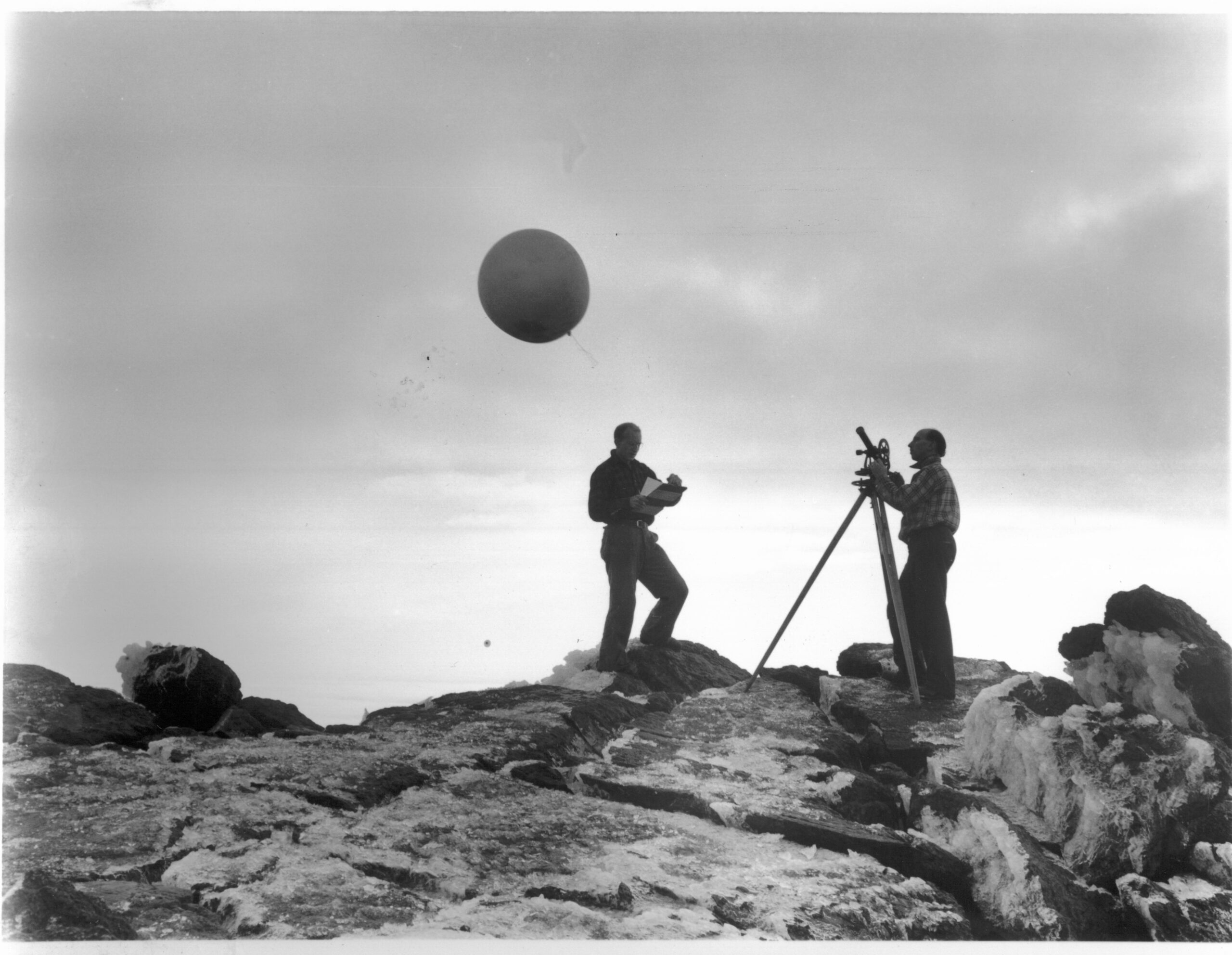 Observers using a weather balloon in the 1930s. Historic data helps today’s scientists understand climate change in the region. Courtesy of the Mount Washington Observatory Library.