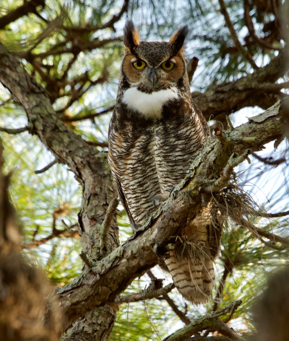 The Great Horned Owl is one of the most common owls in North America. It can be found in almost any semi-open habitat, including backyards and cities. The Great Horned Owl has excellent senses. It has large eyes and pupils that open widely in the dark, giving it phenomenal night vision. However, its eyes never move in their sockets. Instead, the Great Horned Owl can swivel its head more than 180 degrees to look in any direction. It also has sensitive hearing due to the facial disc feathers that direct sound waves to its ears. Its sense of hearing is so acute that it can detect a mouse stepping on a twig from 75 feet (23 meters) away.