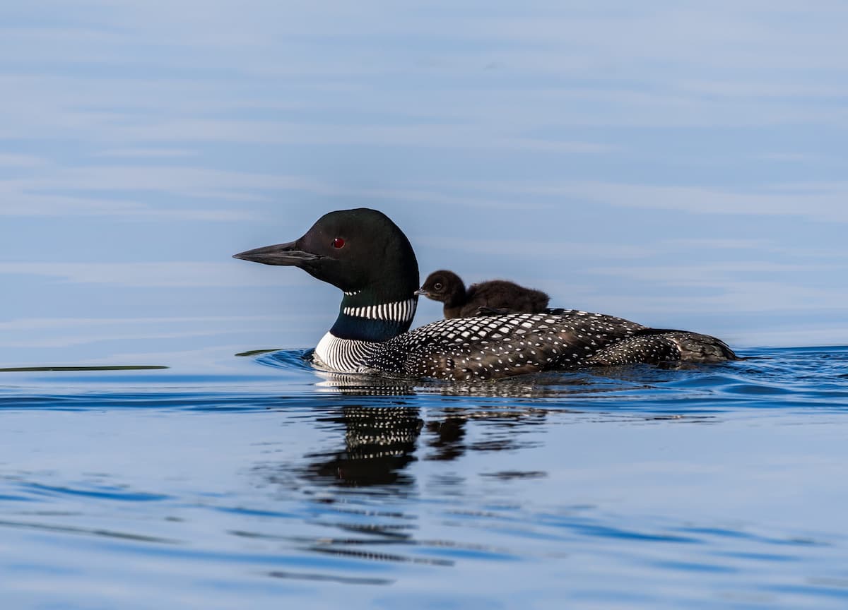 The Common Loon can be found on lakes in the northernmost parts of the United States, particularly in Maine. The loon is a water bird, only going on shore to mate and incubate eggs. In fact, the loon is quite clumsy on land, which is how it got its name. Its legs are located far to the rear of its body, making it difficult to balance. In water, however, loons are adept divers. They can plunge over 200 feet below the water’s surface.