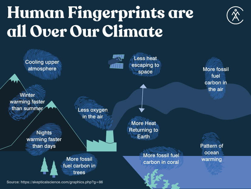 As a refresher, the main contributors to climate change are greenhouse gases that trap heat in Earth’s atmosphere. The main gases that contribute to the greenhouse, trapping the sun’s heat and warming the global climate, are carbon dioxide (CO2), methane, nitrous oxide, fluorinated gases, and water vapor. These gases differ from each other in how long they stay in the atmosphere (from just a few years to millennia) and in how effective they are at storing heat. Some of these gases are naturally occurring, but human activities—especially burning fossil fuels and certain agricultural practices—are the main contributors to greenhouse gas emissions. Indeed, human fingerprints are all over climate change.