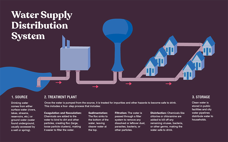 Once the water is sourced from local watersheds, it then needs to go through a filtering process to assure that the water is safe to drink. Water treatment plants add chemicals to the water to bind dirt and other particles, creating large, loose clusters called floc, which sink to the bottom of the water. The water is then filtered through sand, charcoal, and gravel to remove any other impurities before the final disinfecting stage, where chemicals like chlorine or chloramine are added to kill off any remaining viruses, bacteria, or other germs. The water is now safe to drink.