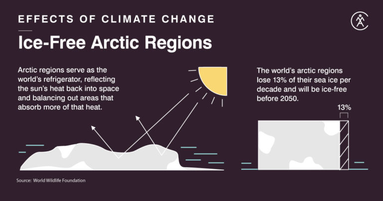 Arctic regions serve as the world’s refrigerator, reflecting the sun’s heat back into space and balancing out areas that absorb more of that heat. The world’s arctic regions lose 13 percent of their sea ice per decade and will be ice-free in summer before 2050. Antarctica, specifically, has been losing about 134 billion metric tons of ice per year since 2002. These polar changes threaten coastal communities in danger from sea level rise, strengthen extreme weather events like polar vortexes, disrupt vital shipping lanes, and endanger wildlife.