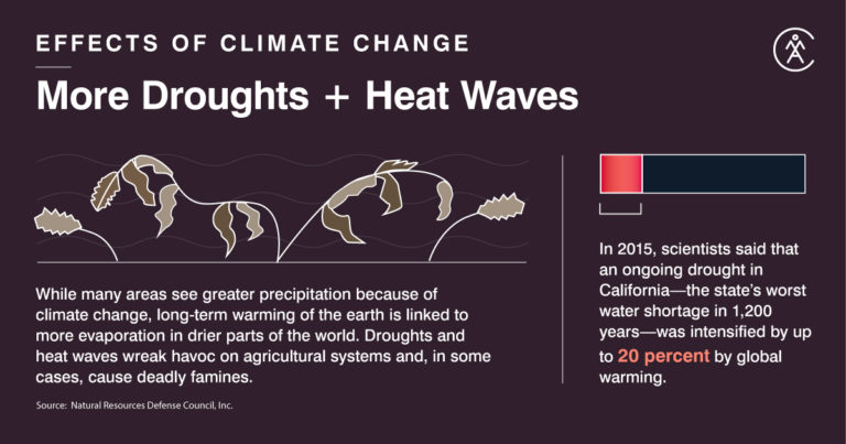 While many areas see greater precipitation because of climate change, drier parts of the world—such as the Southwest United States—may see even less. Long-term warming is linked to more evaporation that can exacerbate droughts. Droughts and heat waves wreak havoc on agricultural systems and, in some cases, cause deadly famines. In 2015, scientists said that an ongoing drought in California—the state’s worst water shortage in 1,200 years—was intensified by up to 20 percent by global warming.