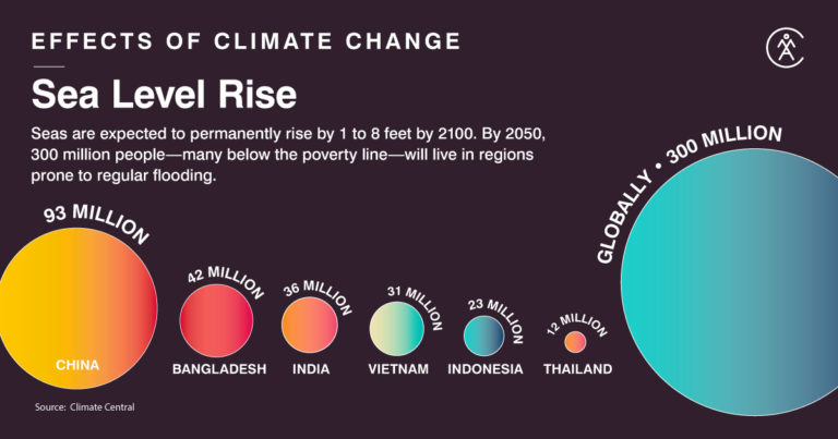 Around the world, ocean levels are rising for two main reasons: the expansion of water as it warms (known as thermal expansion) and the displacement of sea water from melting glaciers and ice caps. Seas are expected to permanently rise by 1 to 8 feet by 2100, forever changing cities’ coastlines. Eight of the world’s 10 largest cities are coastal. By 2050, annual flooding will threaten the homes and livelihoods of 300 million people around the globe, according to a 2019 Climate Central report.