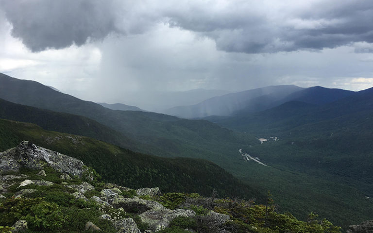 A hiker catches the view of a storm from Glen Boulder Trail in White Mountain National Forest.