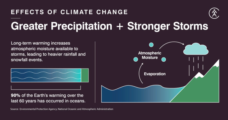 Tropical storms and hurricanes pick up energy passing over warmer oceans. Ninety percent of the Earth’s warming over the last 60 years has occurred in the oceans. Global sea temperatures have increased an average 1.5 degrees Fahrenheit since 1901. Long-term warming increases atmospheric moisture available to storms, leading to more severe heavy rainfall and snowfall events. North Atlantic hurricanes have been on the rise since the 1980s. Each year, hurricane winds and storm surges destroy homes and businesses, often hurting those living in poverty the most.