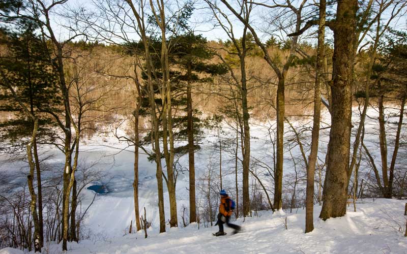 The protection of Valley Forge National Historical Park has preserved several miles of the Schuylkill River as undeveloped green space. From the Belzwood Trailhead, follow the River Trail west. About a mile along, visit the site of Sullivan’s Bridge, the only bridge built by the Continental Army during the Revolutionary War. At the 3-mile mark, look across the river to see Washington’s Headquarters, a stone house where George Washington lived during his time at Valley Forge. Shortly after that, the trail loops around and turns into the Walnut Hill Trail heading back east. You can snowshoe or cross-country ski along the river.