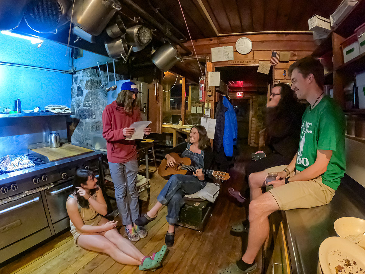 Once the dishes are clean, programs complete, and the guests are in their bunks, the Mizpah Spring Croo, plus Nauman Tentsite Caretaker Uli Schwendener, have a singalong in the kitchen. Burnet plays an acoustic guitar and Schwendener solos on a melodica. Cooper keeps rhythm with a pair of spoons. They start with a new song, “Dried Roses” by Big Thief, followed by the classic “Country Roads” by John Denver.