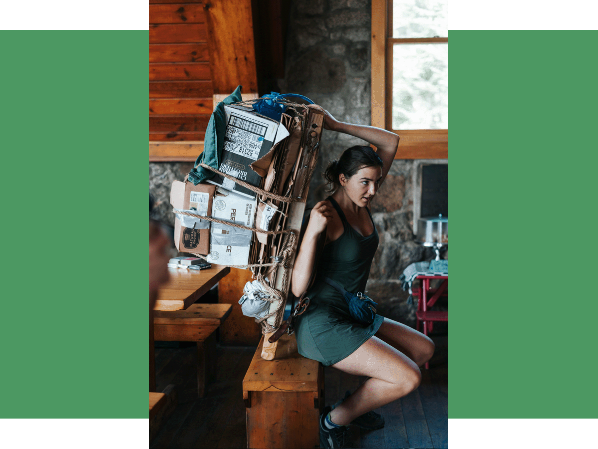 Croo members share chores and switch off handling two of their largest responsibilities: Packing and cooking. On pack days, most of the Mizpah Spring Croo head down the Crawford Path with all the Hut’s trash strapped to a packboard. Each Croo member gets their own packboard for the season, and many are adorned with the names of past Croo who’ve used them. While most packs distribute weight with straps across the body, packboards utilize only two around the shoulders. This keeps Croo safer if they trip while packing (which everyone has a story about) but makes the hikes a uniquely challenging workout.