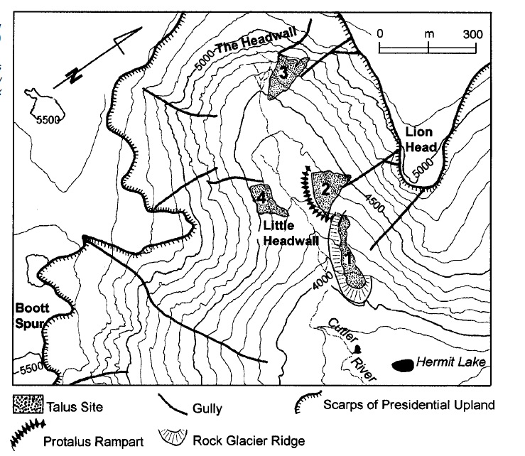 A map of the talus sites at Tuckerman Ravine