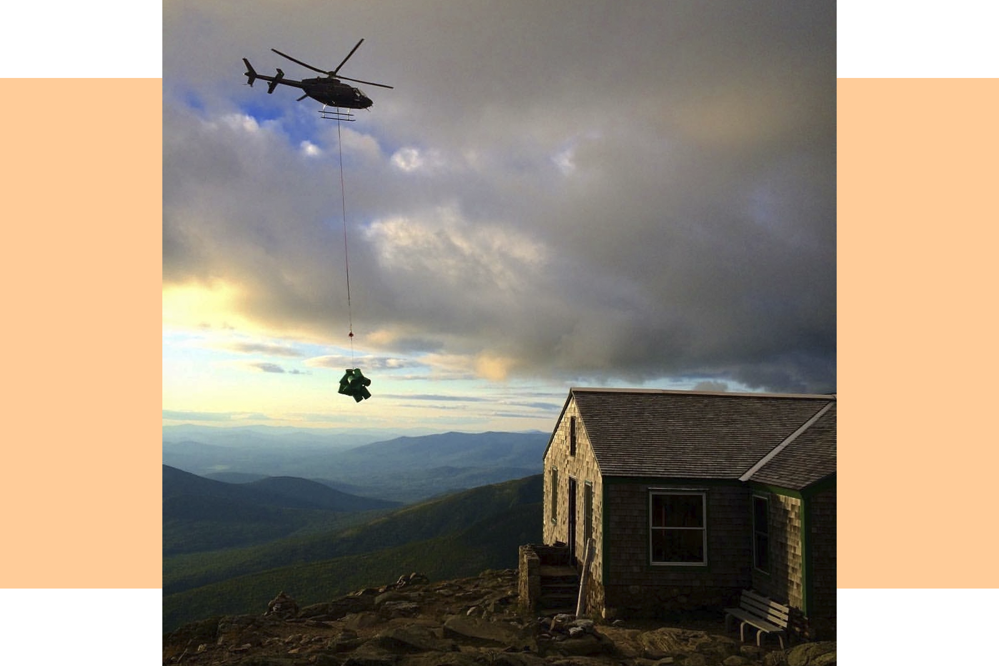 In late spring, AMC hut and storehouse staff begin working with a helicopter service to airlift supplies and non-perishable food to each hut. These include items that would be impossible to carry to the huts on foot or are too heavy or bulky to make it practical, like bags of sugar and flour. It takes months of advance planning to get ready for the airlifts.