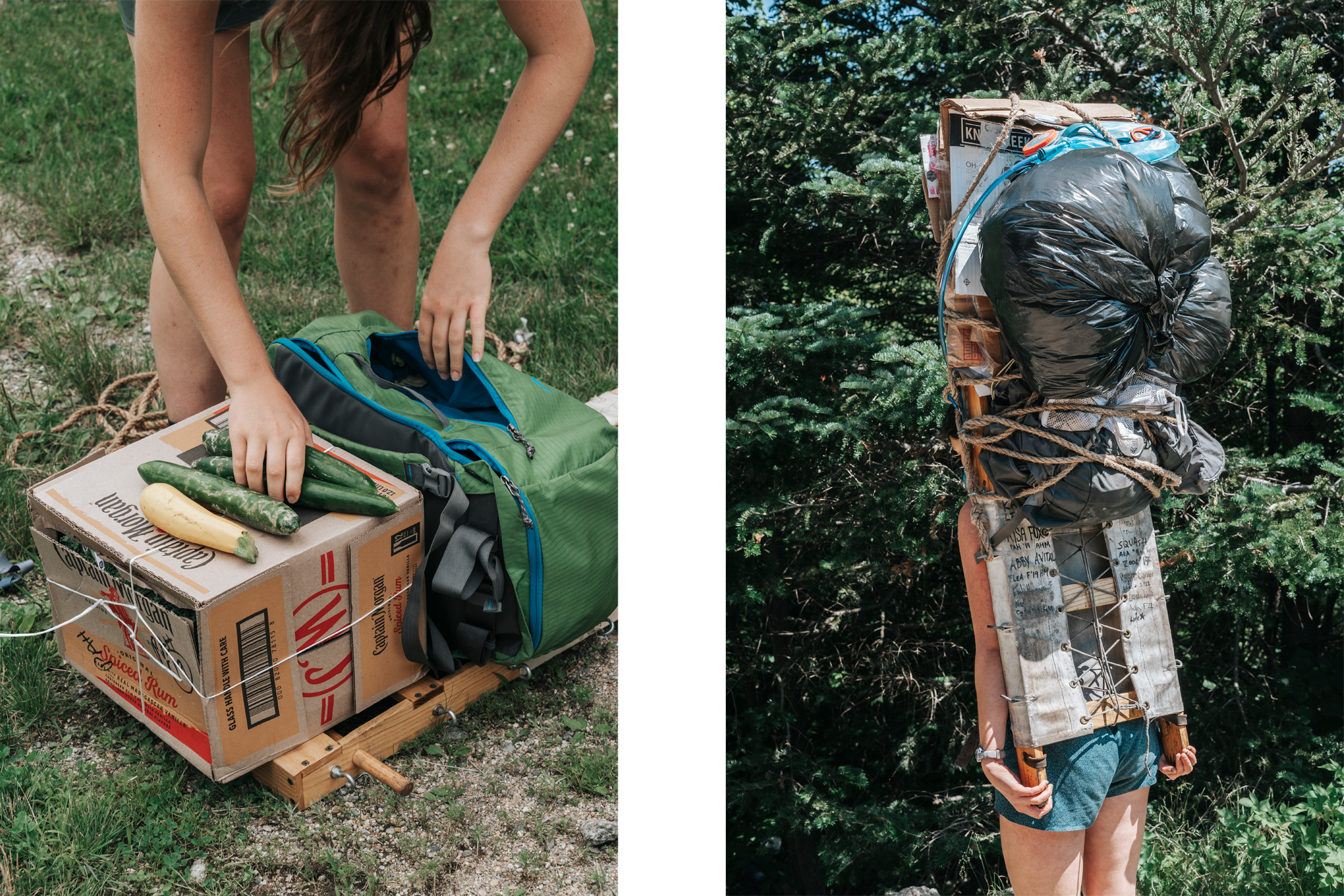 Once the truck drop is complete, food is now the responsibility of the hut Croo. Each Croo member at the trailhead loads up a packboard, a pack made from a wooden frame and straps of leather, with food. They’ll be responsible for carrying it up to the hut. While this method may seem old-fashioned, it’s done for a reason. Packboards distribute weight on the body differently from a backpacking pack, so if a user trips, they’ll fall in a safer manner.