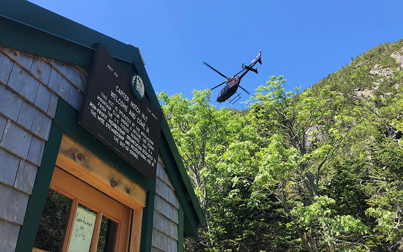 A helicopter arrives with extra supplies during Thacher’s first week at Carter Notch hut.