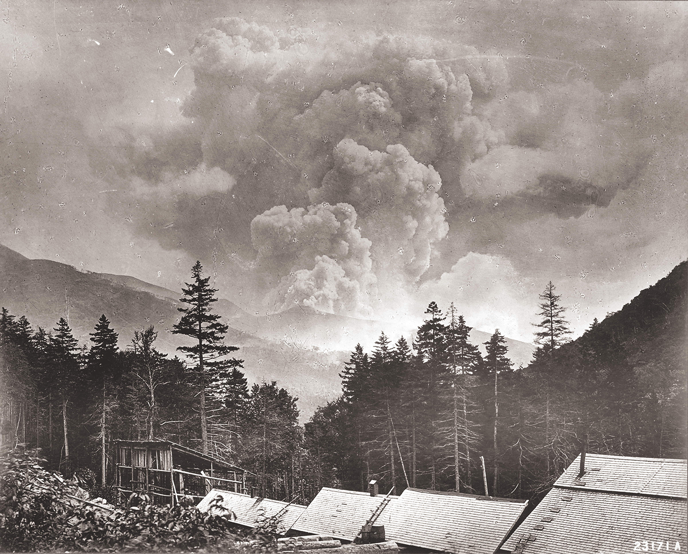 Plumes of smoke from the 1907 Owl’s Head fire at the head of the Franconia Brook Trail as seen from a logging camp miles away.