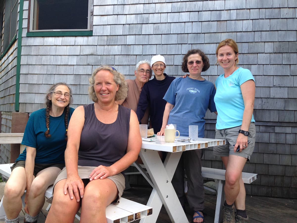Steve and Betsy Corman (center back) with friends at AMC’s Lonesome Lake Hut in 2014, a short time before Betsy’s passing in 2015.