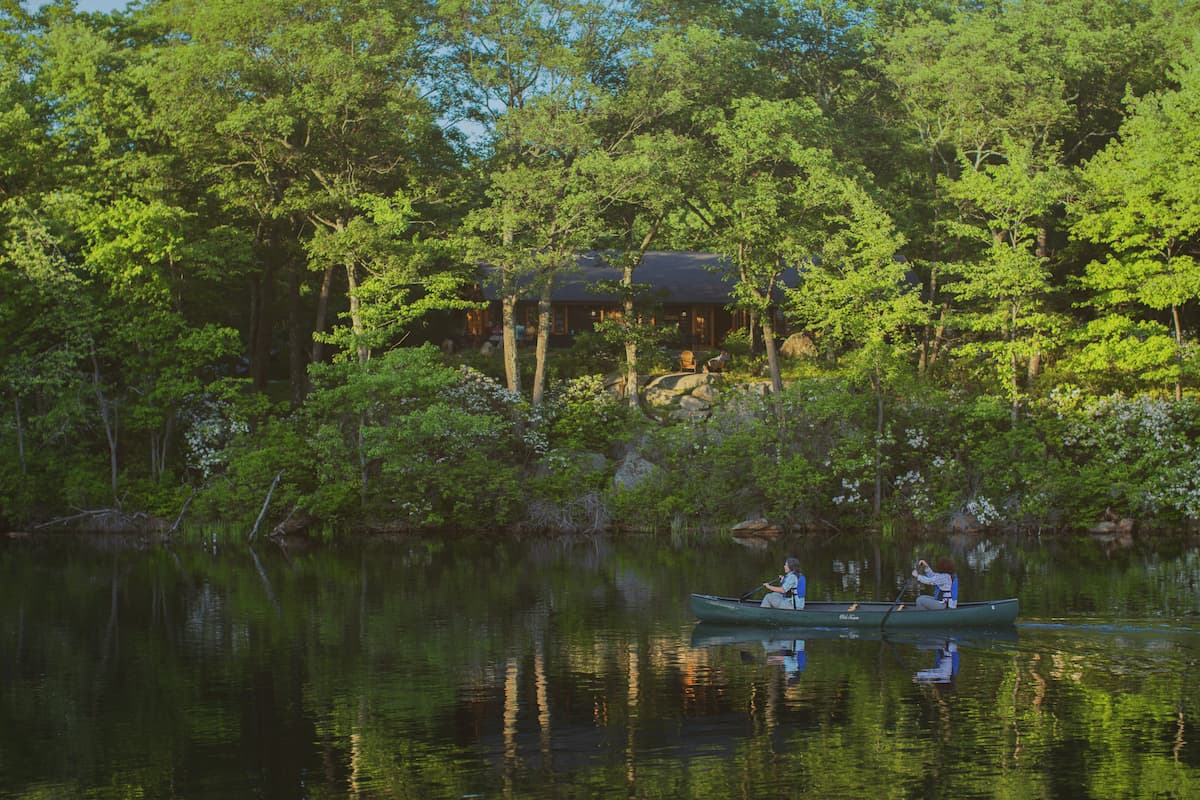 Boaters enjoy Breakneck Pond at the Stephen and Betsy Corman AMC Outdoor Center, for which Stephen Corman made a major gift.