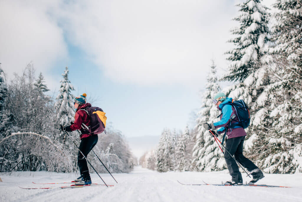For your first cross-country skiing adventure, consider taking a lesson, or at least go with someone who knows how to ski already. Cross-country skiing is a technique-driven sport, so laying a proper skills foundation is important. Learning how to kick and glide on your skis, push off with your poles, snowplow stop, “herringbone” uphill, and right yourself after a fall are all skills to tackle on day one.