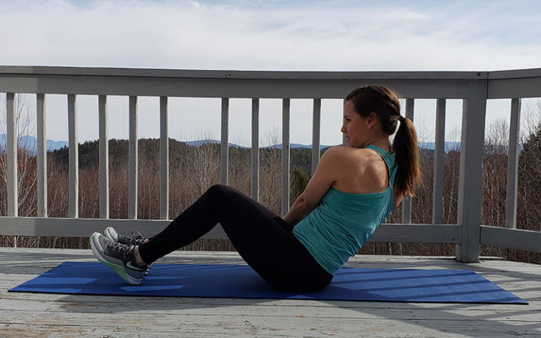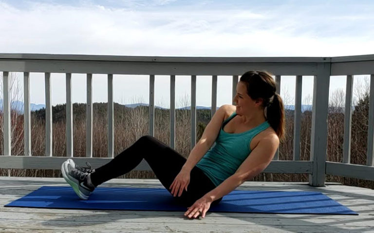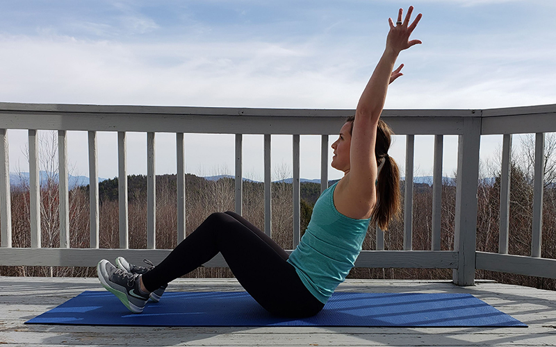 Starting Position: Sit on a mat or floor with your knees bent, feet together, and heels on the floor, with your arms out in front of you. Lean back just an inch to engage your core.