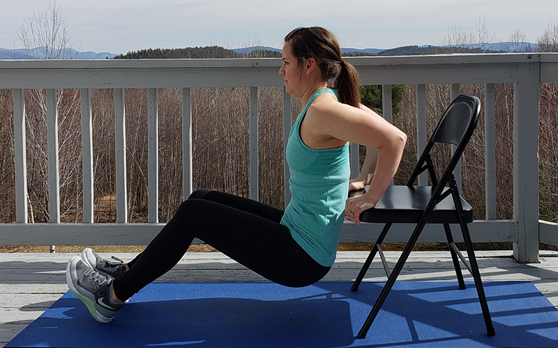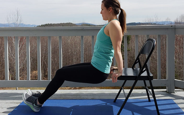 Position your hands shoulder-width apart on a secured bench or stable chair. Slide your butt off the front of the seat with your legs extended out in front of you. Straighten your arms, keeping a little bend in your elbows to keep tension on your triceps and off your elbow joints. Slowly bend your elbows to lower your body toward the floor until your elbows are at about a 90-degree angle. Be sure to keep your back close to the seat. Once you reach the bottom of the movement, press down into the bench to straighten your elbows, returning to the starting position. This completes one rep. Keep your shoulders down as you lower and raise your body. You can bend your legs to modify this exercise.