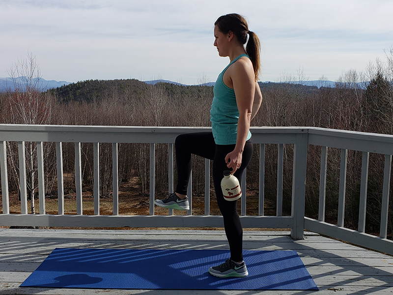 Balance on your left leg while holding a fixed weight (free weight or gallon jug) in your left hand. Keep your left knee slightly bent and your back straight while leaning forward on the left hip. While you’re leaning forward, straighten your right leg and point the right toes to help stay balanced. Keep your arm straight so the weighted dumbbell or jug is lowering directly in front of your left leg. Push your left foot into the floor, pull back on your left knee, and lower your right leg to stand up, keeping your grip on the dumbbell. Pause in a balanced position before performing the next repetition.