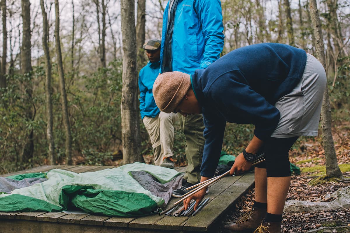 1. Find a good spot for your tent. Look for flat, level-ground free of sticks or stumps. If needed, brush aside rocks, branches, pinecones, and any other removable object before setting up your tent floor. Be sure to put these objects back after you leave your campsite. And don’t forget to look up – ensure that your space is free of dead trees or “widow makers,” the low-hanging tree branches that are about to fall.