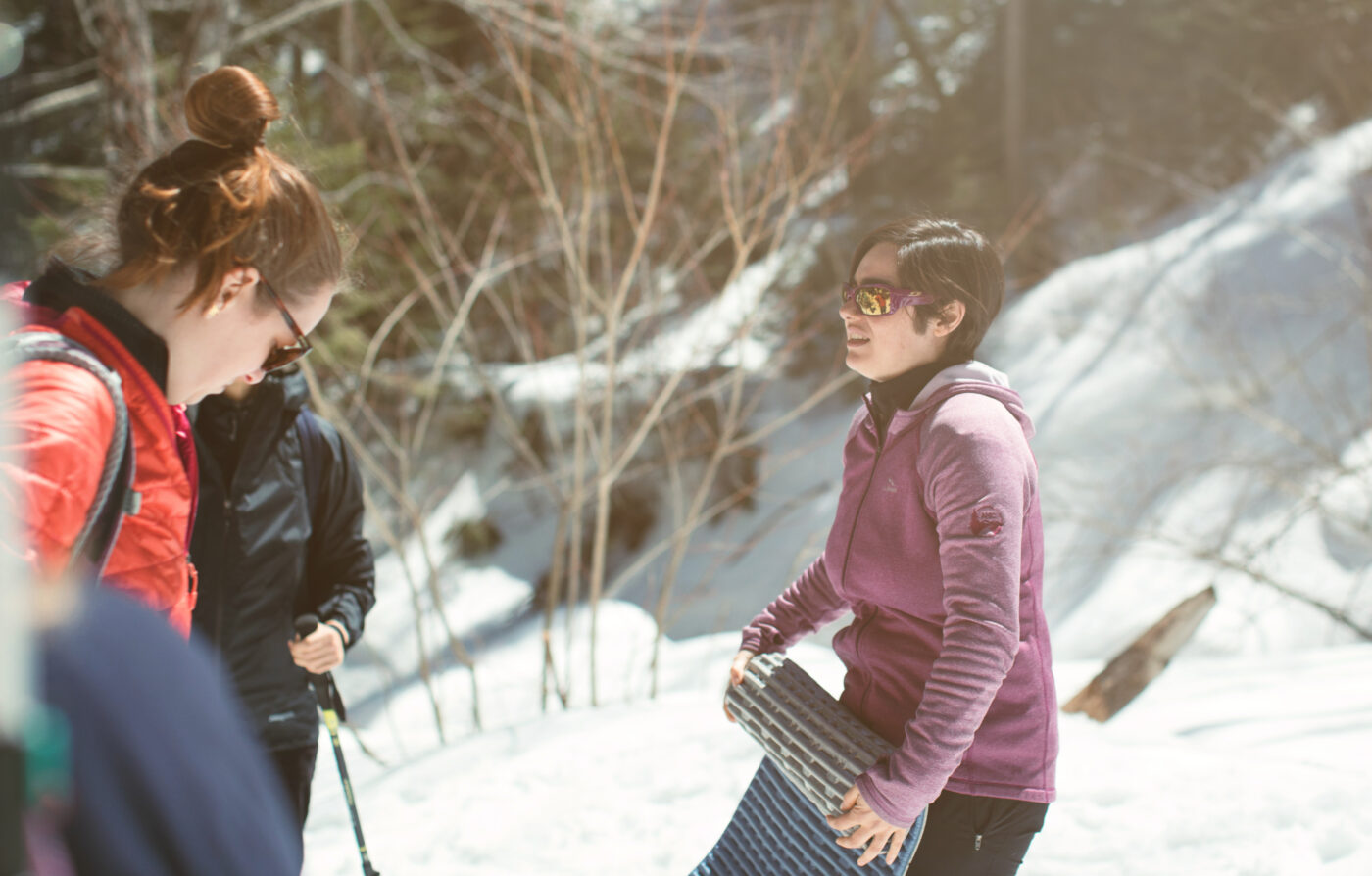 An AMC guide rolls up her sleeping pad after a break during an AMC Women’s Adventure: Outdoor Skills program. In winter, many AMC guides carry sleeping pads to sit on during lunch or snack breaks so they don’t have to sit directly on snow.
