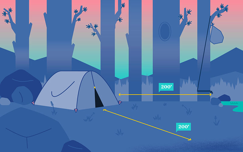 When camping, be sure to set up your site 200 feet away from any water source, as well as 200 feet away from the trail.